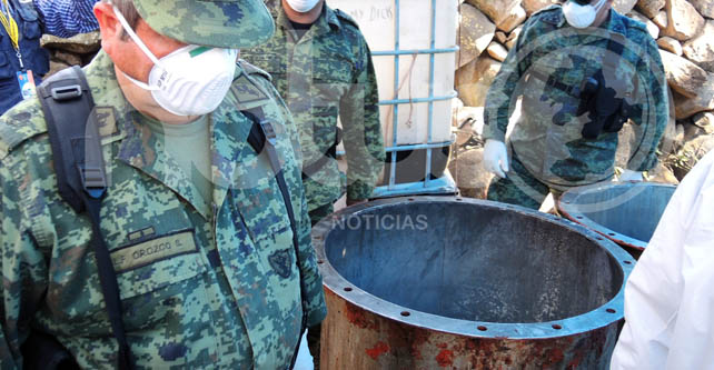 En el interior se encontraron tambos con precursores químicos usados en la confección de drogas, además de seis botes con droga conocida como cristal que superan las 200 mil dosis en las que se podía dividir, aunado a ello varios botes con capacidades de hasta mil quinientos litros de droga.