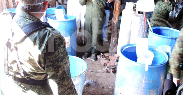 Cuerámaro, Pénjamo.- El Octavo Regimiento del Reconocimiento Blindado del Ejército Mexicano, desmantelo dos laboratorios en los que se fabricaba droga, uno de ellos, el más grande que se ha localizado en Guanajuato entre los límites de Cuerámaro y Pénjamo con una producción de varias toneladas de substancias prohibidas; tan sólo dentro de los decomisado, se calculan 200 millones de pesos; no hubo detenidos.