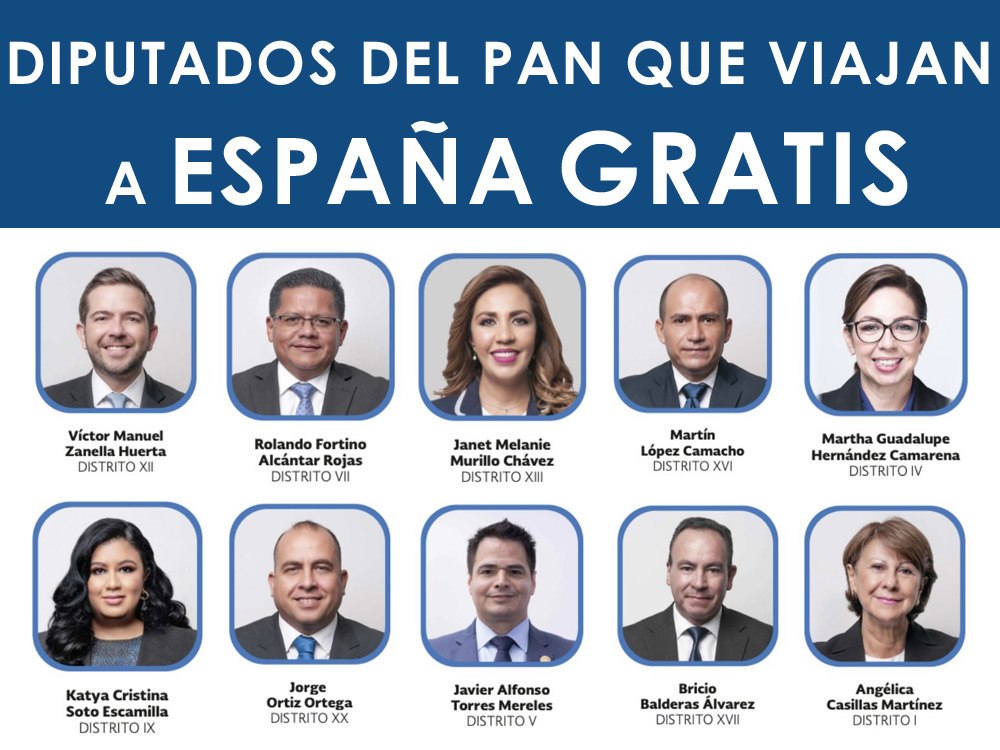 Irapuato, Guanajuato.- De los 16 diputados que se van a España a un “curso de Derechos Humanos”, ocho de ellos son de los llamados plurinominales, es decir, que nadie los eligió y entre los “afortunados”, 6 son de MORENA, 3 son del PRI y uno es del Partido Verde, ligado a la llamada Cuarta Transformación.