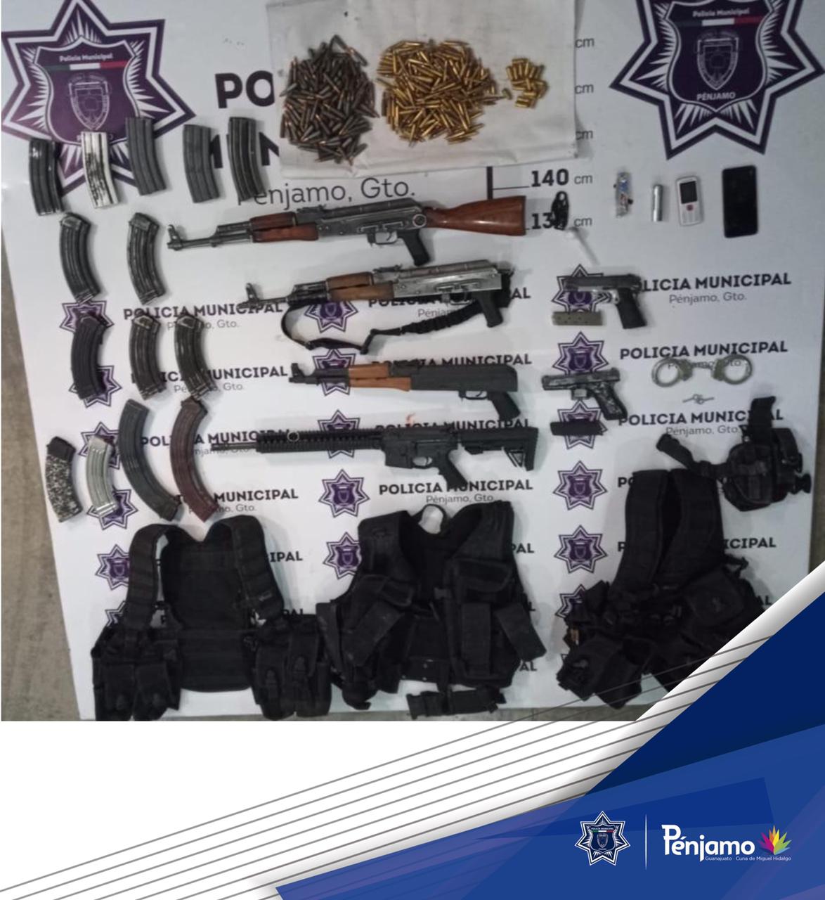 Además se les aseguró 4 armas largas, 2 armas cortas, más de 200 cartuchos de diferentes calibres, cargadores, equipo táctico, teléfonos celulares, navajas, así como la camioneta en la que viajaban.