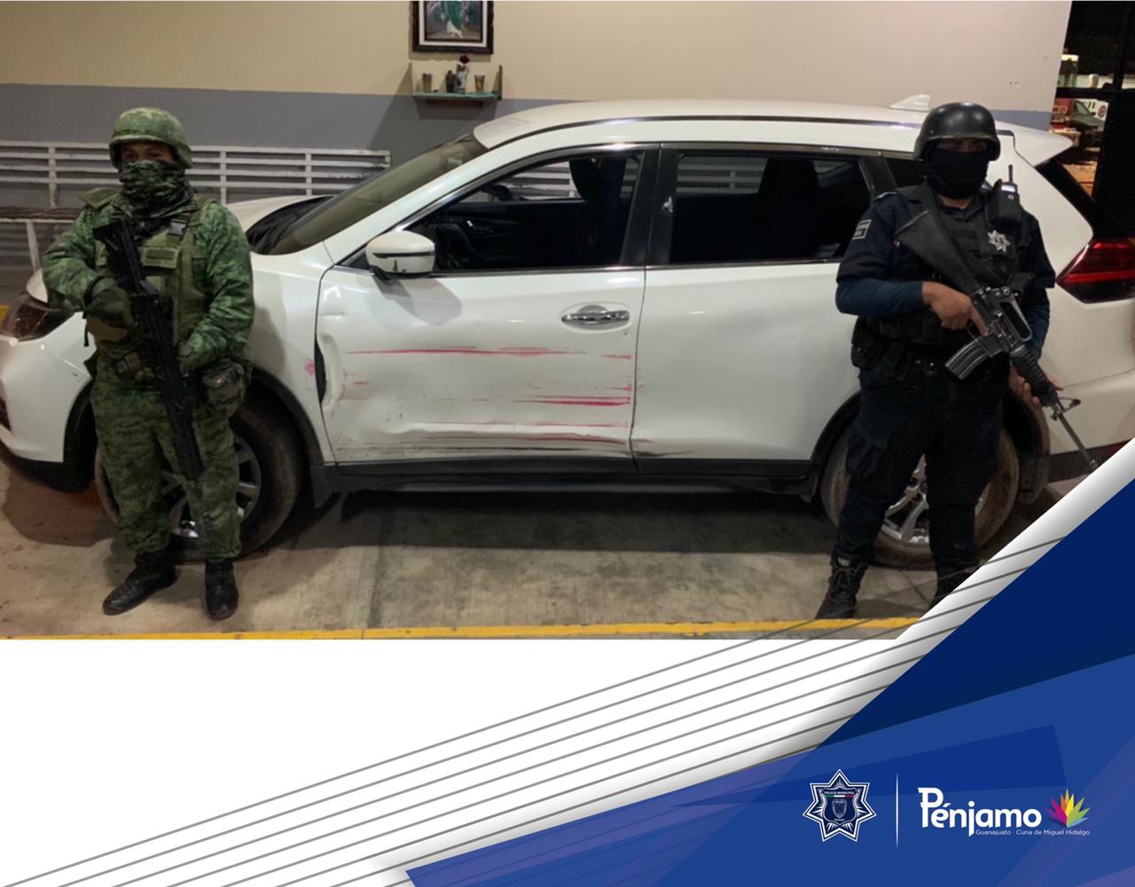 Realizando labores de vigilancia, los elementos escucharon detonaciones de arma de fuego en la colonia El Tolento, ubicando a los responsables que viajaban en una camioneta Nissan X- Trail color blanco, iniciando la persecución sobre el boulevard Degollado, hasta culminar en la comunidad de El Zapote de Cestau.