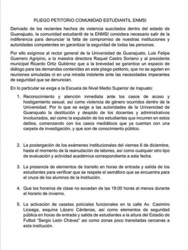 El pliego petitorio expresa la exigencia de los alumnos para que sean escuchados en cuestión de acoso y hostigamiento sexual, así como de violencia de género, la vigilancia de parte de las autoridades en la entrada y salida de la escuela, salir más temprano de clases en horario de invierno, la instauración de casetas policiales, entre otras demandas.