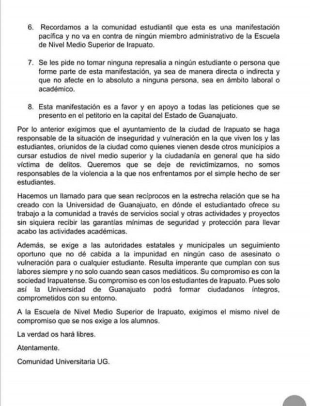 Según hicieron saber los alumnos, la protesta se realizó para manifestar el hartazgo y preocupación ante la postura de pasividad de los mandos universitarios y del Estado ante las situaciones de riesgo que se han venido dando en materia de seguridad.