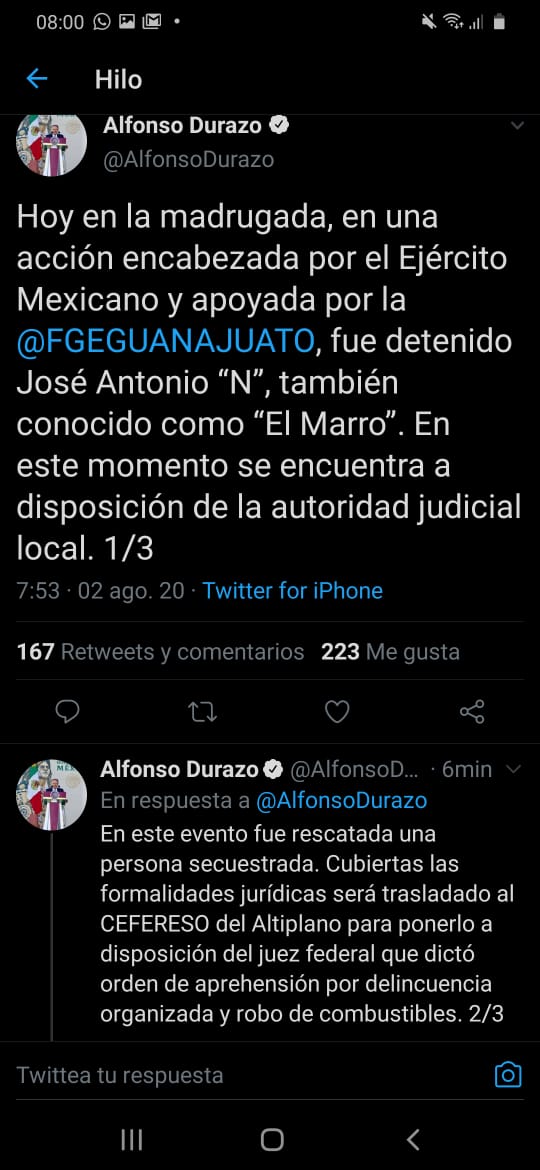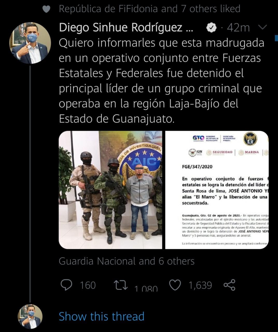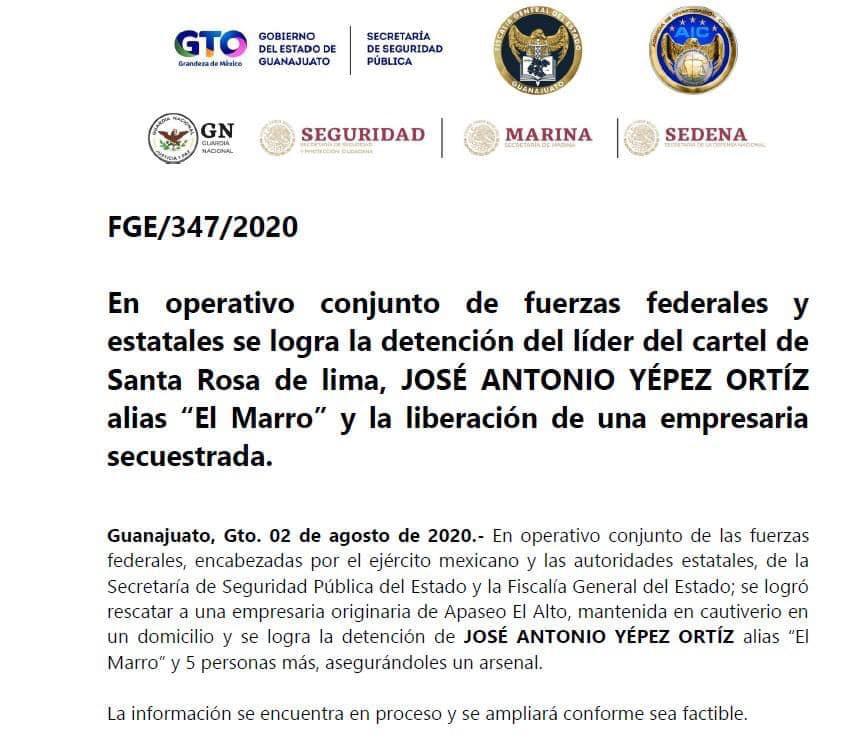 Al igual había una persona secuestrada “en operativo conjunto de fuerzas federales y estatales se logra la detención del líder del cartel de Santa Rosa de Lima y la liberación de una empresaria secuestrada”.