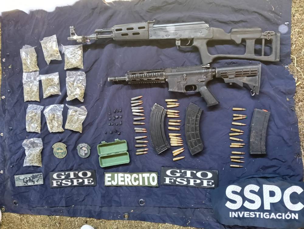 Durante la intervención también se aseguraron un arma larga tipo AK-47 con dos cargadores y 32 cartuchos, así como un fusil AR-15 con un cargador y 15 cartuchos. En el mismo lugar se localizaron 12 dosis de una sustancia granulada similar al cristal y 10 dosis de hierba verde y seca con características de marihuana.