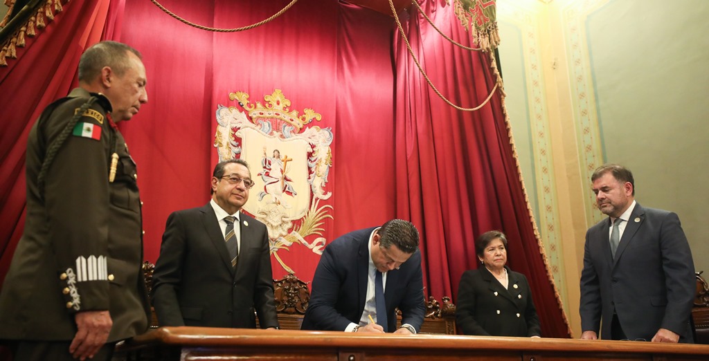 Al presidir la sesión solemne de la Comisión de Celebraciones por los 200 años de Guanajuato como Entidad Libre y Soberana, el Ejecutivo Estatal entregó la nueva Bandera con el Escudo oficial del Estado de Guanajuato a la escolta de las Fuerzas de Seguridad Pública del Estado (FSPE).