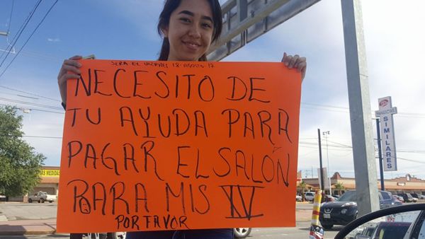 Este sábado 12 de agosto una adolescente salió a las calles de la ciudad con una cartulina fosforescente con la leyenda “necesito de tu ayuda para pagar el salón de mis XV años”.