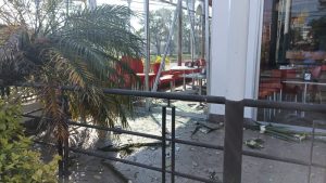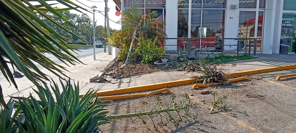 El automovilista se llevó a su paso parte de la jardinería que adornaba la entrada del estacionamiento compartido con otros negocios ubicados a un costado del establecimiento. La pizzería quedó con algunos cristales rotos y parte de los barandales de protección de su acceso dañados.