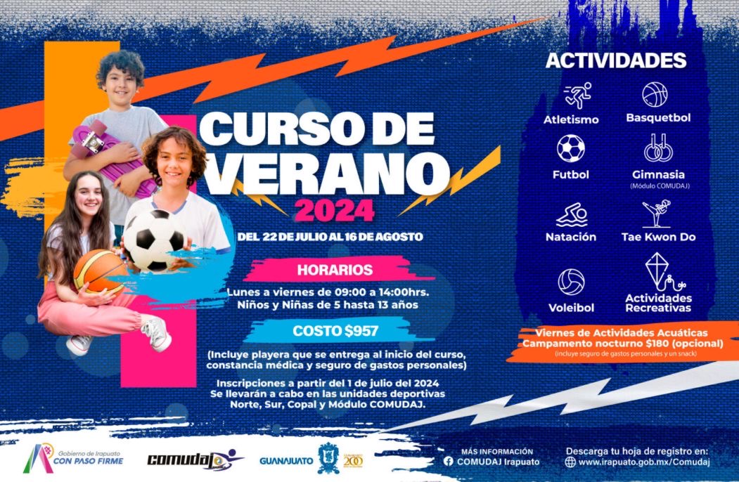 Irapuato, Guanajuato. – La Comisión del Deporte y Atención a la Juventud del Municipio de Irapuato (COMUDAJ) hizo un llamado a los niños y niñas de la ciudad para que se inscriban en el Curso de Verano 2024.