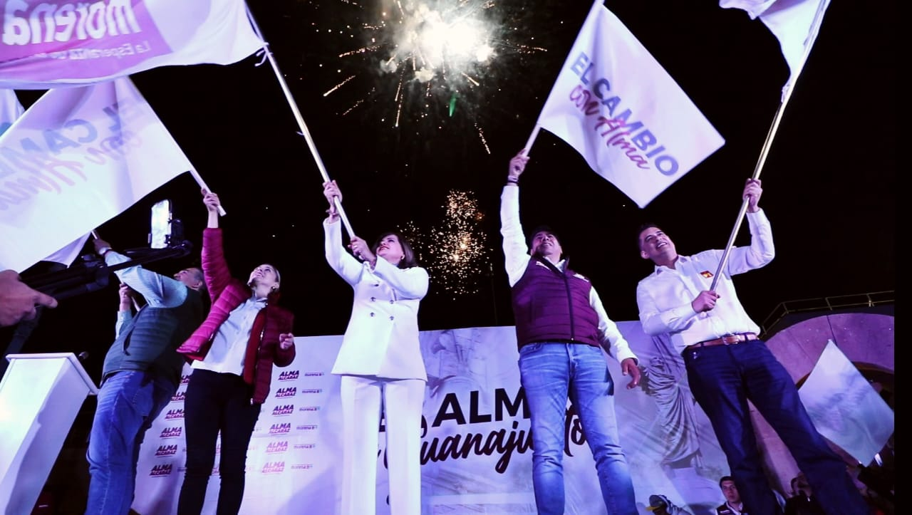Banderas del Movimiento de Regeneración Nacional (Morena), Partido Verde Ecologista de México (PVEM) y Partido del Trabajo (PT) fueron ondeadas cuando su candidata dijo que “ha llegado el momento de la nueva independencia de Guanajuato”.