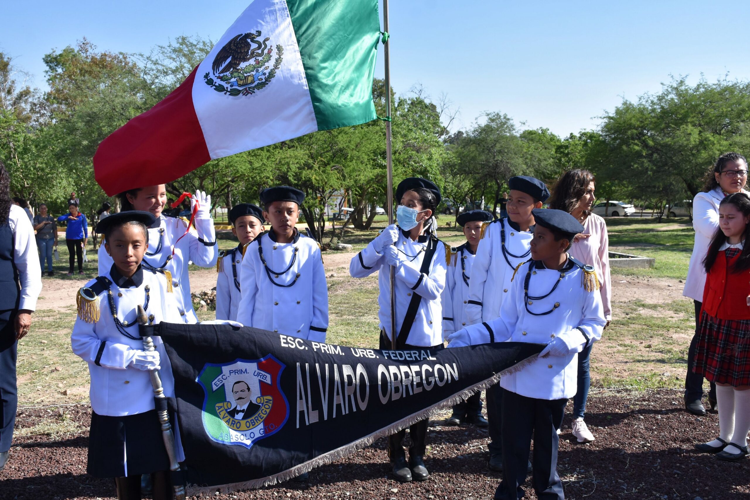 El Acto Cívico se llevó a cabo en las inmediaciones del Parque Miguel Hidalgo, donde se dieron cita las Autoridades Municipales encabezadas por Rocío Cervantes Barba, así como integrantes del H. Ayuntamiento, Directoras y Directores de la Administración Pública Municipal, además, se contó con la presencia de la Jefa de USAE Abasolo, Liliana Guadalupe García Pérez, alumnas y alumnos de las diferentes Instituciones Escolares escoltando sus Lábaros Patrios, Docentes y Directivos.