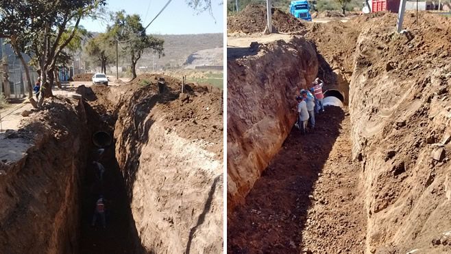 La obra en su primera etapa consiste en suministro y colocación de tubería para alcantarillado de PVC, construcción del colector pluvial y construcción de nueve pozos de visita.