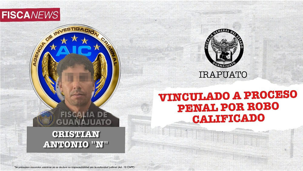 CRISTIAN ANTONIO “N” robó un vehículo y pertenencias de una vecina en la ciudad de Irapuato. Tras recibir la denuncia, la Fiscalía de Guanajuato investigó los hechos y obtuvo pruebas que acreditaron la probable responsabilidad del imputado, quien ya se encuentra en prisión, vinculado a proceso penal por el delito de robo calificado.