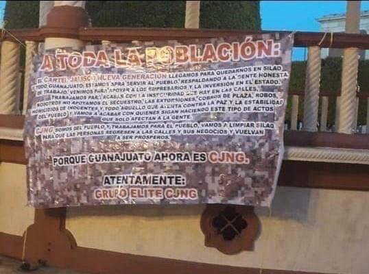 “A TODA LA POBLACIÓN EL CARTEL JALISCO NUEVA GENERACIÓN LLEGAMOS PARA QUEDARNOS EN SILAO Y TODO GUANAJUATO; ESTAMOS PARA SERVIR AL PUEBLO, RESPALDANDO A LA GENTE HONESTA DE TRABAJO.