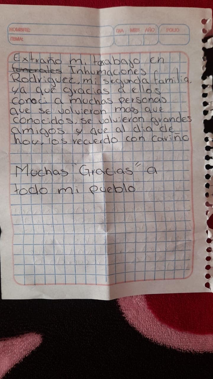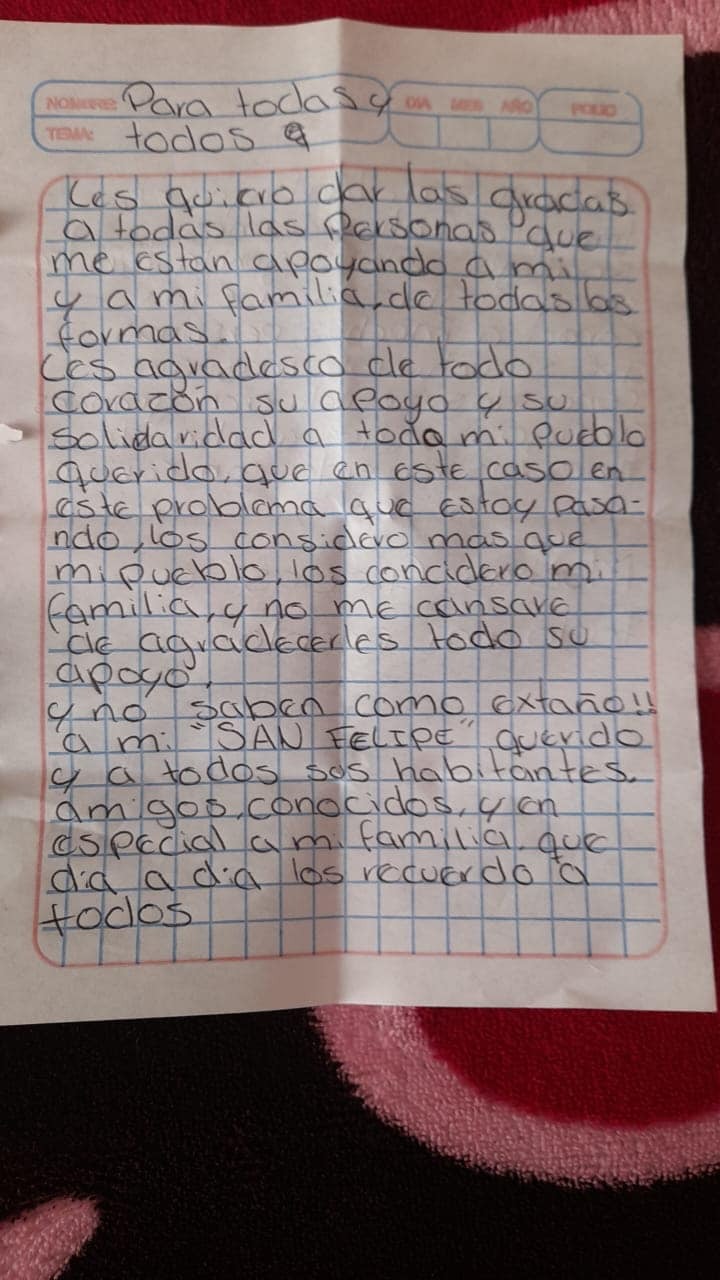 “Les agradezco de todo corazón su apoyo y solidaridad a todo mi pueblo querido, no saben como extraño a mi familia, mi trabajo y a mi San Felipe querido”; redactó Pedro en una hoja de libreta.