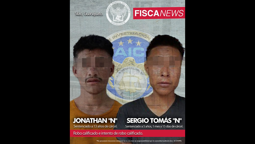 Ante las pruebas presentadas por el Ministerio Público, JONATHAN “N” alias “El Bubu”, de 20 años de edad y SERGIO TOMÁS “N”, de 22 años, aceptaron la responsabilidad en los delitos de robo calificado y robo calificado en grado de tentativa, por lo que fueron sentenciados a 13 años de cárcel y 5 años, un mes y 15 días de cárcel, respectivamente.