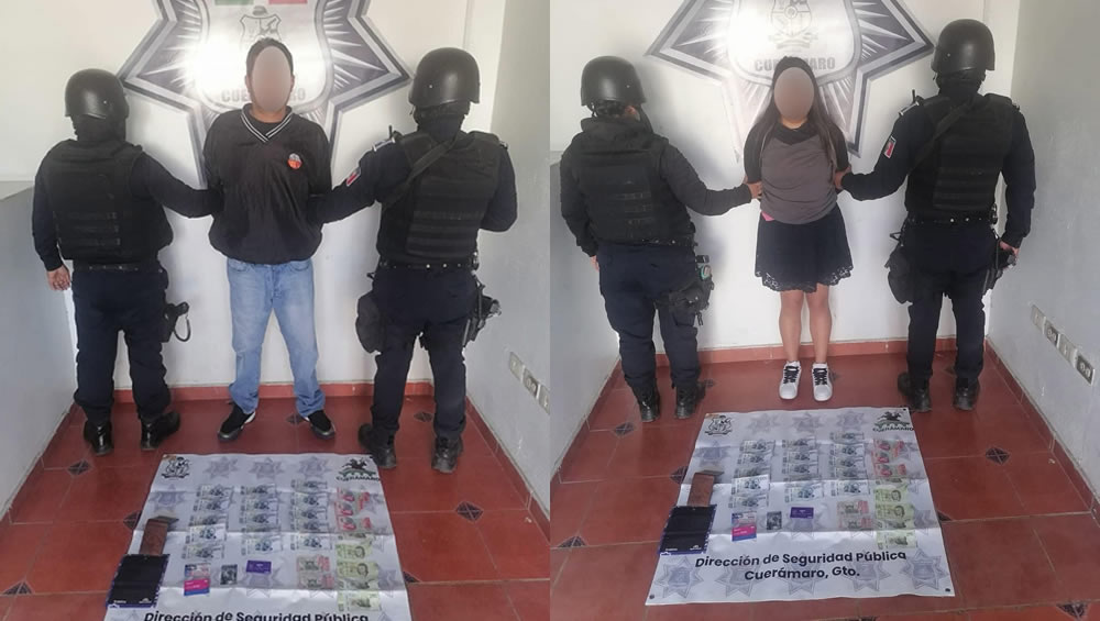 Cuerámaro, Guanajuato. – La Policía Municipal logró la detención de una pareja que intentaba cambiar 15 billetes de mil pesos falsos en varios negocios locales.