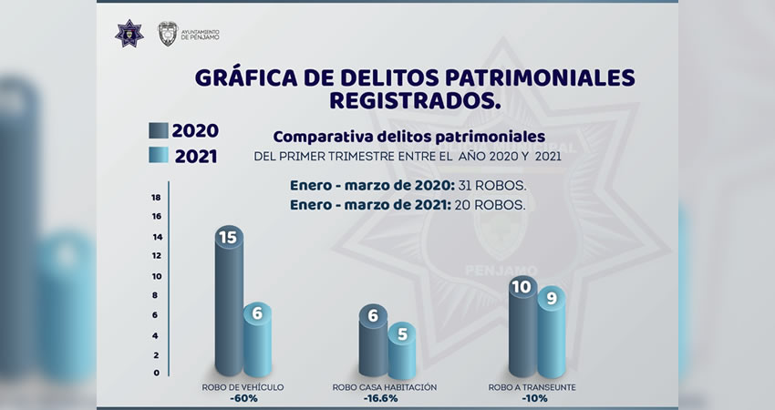 En lo que va del 2021, hasta un 60 por ciento, han disminuido los delitos patrimoniales en Pénjamo, resultado del trabajo coordinado entre Seguridad Pública Municipal y la ciudadanía a través de la denuncia.