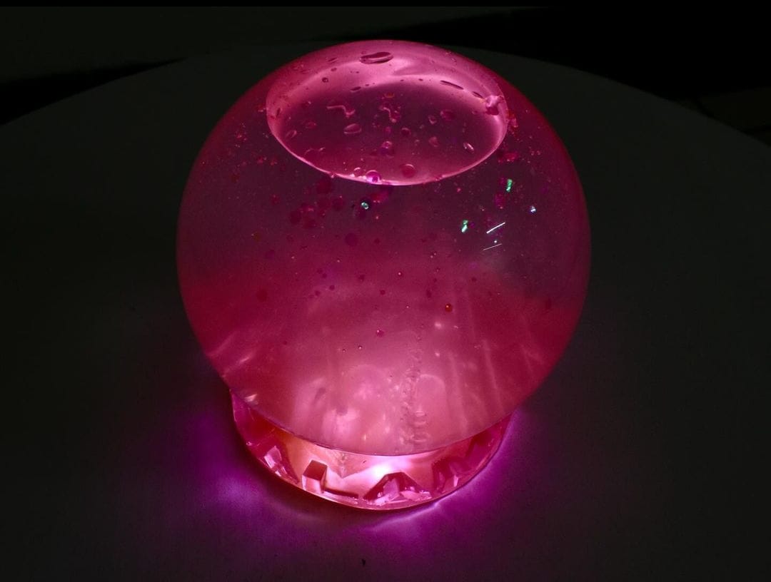 “Esta pieza nació entre los años 2019 y 2020 y pudo ser completada gracias a la Seminaria, está hecha en modelado 3D donde me auxilié con un programa informático, después tuve la ayuda de Gabriel Lengeling y luego se imprimió en resina, contiene una versión imaginaria de la Refinería Antonio M. Amor que se encuentra en Salamanca, esta rellena de glicerina y de pigmento tornasol con glitter, la acompaña un audio con una grabación del silbato que la planta acciona diariamente y que se escucha prácticamente en toda la ciudad”, dijo.