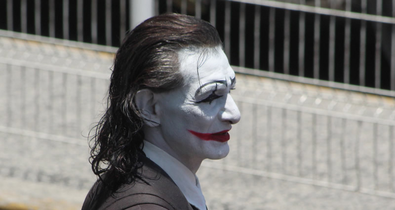 Irapuato, Guanajuato (Ariadna Hernández).- Oculto tras el maquillaje de Joker o de cuervo, vestido de traje y corbata, valiéndose de sus creencias en Dios y la Muerte colgados en una cadena sobre el pecho es como se gana la vida Héctor Alejandro Limón Salinas de 50 años de edad.