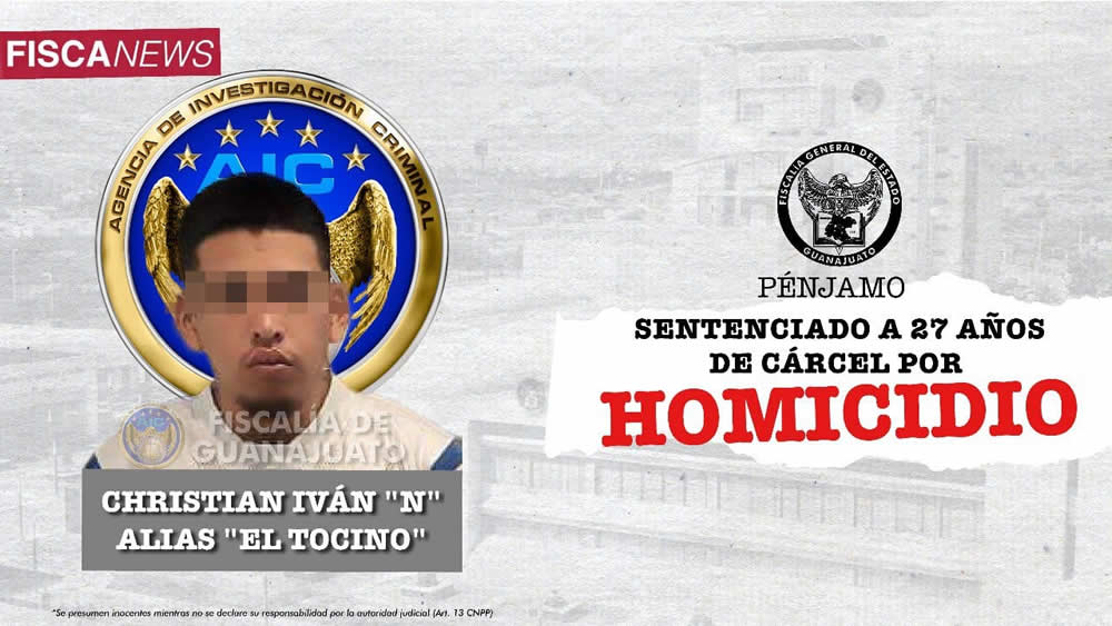Pénjamo, Gto.- Luego de una investigación de la Fiscalía en contra de CHRISTIAN IVÁN “N” alias “El Tocino”, el acusado ha sido sentenciado a pasar 27 años de su vida tras las rejas por el asesinato de Rubén “N”, ocurrido el 01 de abril de 2021, en la calle Lázaro Cárdenas en zona centro de la ciudad de Pénjamo. Un Juez analizó las pruebas presentadas por el Ministerio Público y dictó sentencia.