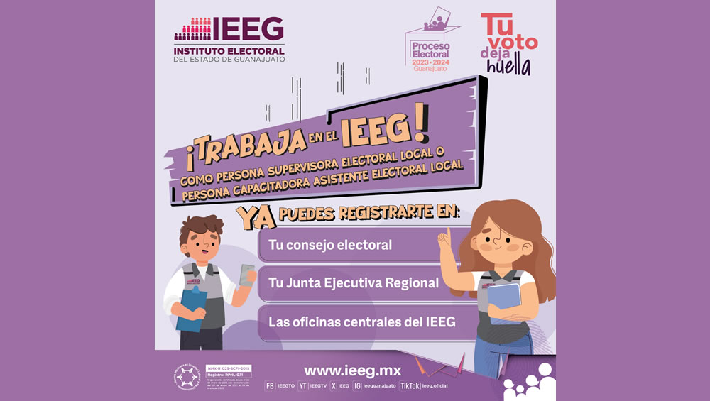 El Instituto Electoral del Estado de Guanajuato (IEEG), a través de la Comisión de Capacitación y Organización Electoral, invita a la ciudadanía guanajuatense a trabajar como personas supervisoras electorales locales (SEL) o como personas capacitadoras asistentes electorales locales (CAEL) en el Proceso Electoral Local Ordinario 2023-2024.