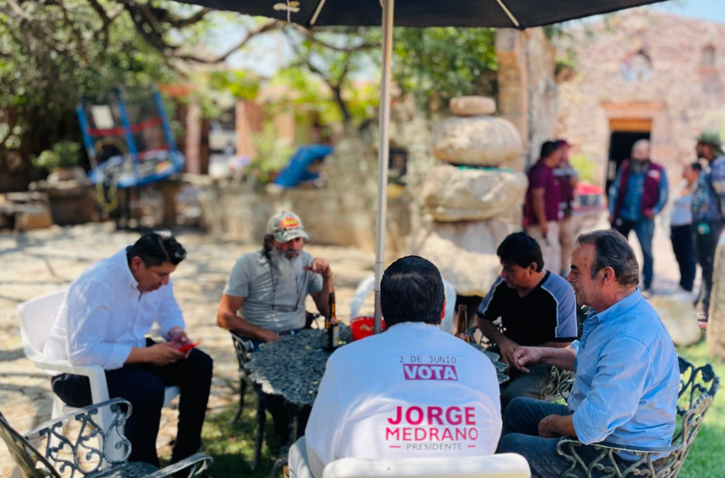 Jorge Rodríguez Medrano, el candidato de Movimiento de Regeneración Nacional (Morena) se fue a tomar caguamas y cantar rolas de José Alfredo Jiménez con albañiles de una pequeña construcción en la comunidad de Yerbabuena, al sur de la ciudad. No tuvo tiempo de hacer promesas de campaña, pues dedicó energías a acusar al gobierno panista de presuntamente organizar manifestaciones en su contra; esto debido a que horas antes un grupo de pepenadores fue a la sede del canal de televisión del neomorenista a protestar contra su candidatura.