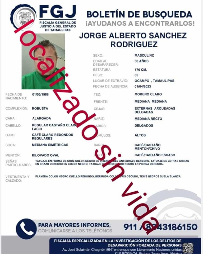 Por otro lado, Jorge Sánchez, cuya desaparición fue reportada el 1 de abril, también fue encontrado sin vida el mismo día de ayer, según informó el colectivo de búsqueda en su página de Facebook.