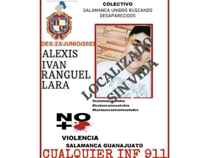 Salamanca, Guanajuato.- El colectivo de búsqueda “Salmantinos Unidos Buscando Desaparecidos” encontró al joven Alexis Iván Rangel, quien fue reportado como desaparecido el pasado 23 de junio de 2023 en Salamanca.