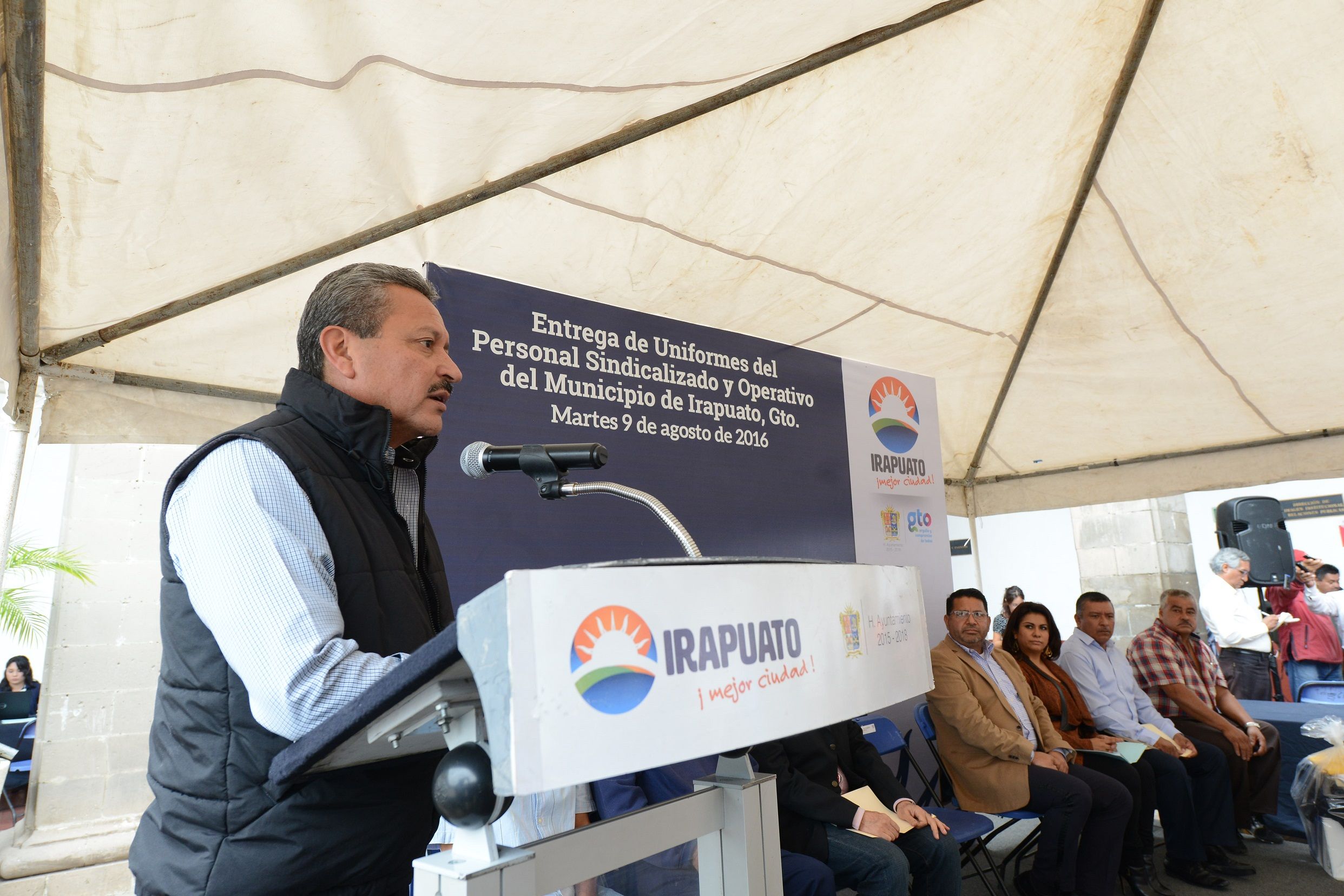Irapuato, Guanajuato.- En cumplimiento de los compromisos del contrato colectivo de trabajo con los sindicatos de Mercados, Rastro, Tesorería y Servicios Municipales el Alcalde Arq. Ricardo Ortiz Gutiérrez, con inversión de 2 millones 840 mil pesos, entregó, simbólicamente, uniformes y zapatos a 797 empleados municipales sindicalizados.