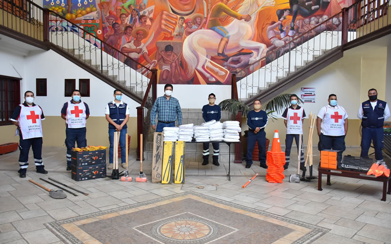 El equipo de trabajo para Protección Civil consta de 2 motosierras, 2 marros, 2 corta pernos, 2 hachas, 2 barras, 2 picos, 4 linternas recargables, 6 banderolas, 20 conos de precaución, 1 juego de cables pasa corriente, 4 rastrillos y 1 juego de dados de 25 piezas.