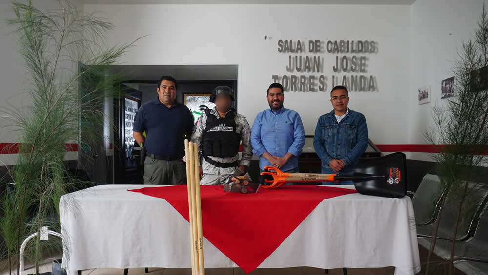 La presidencia municipal de Cuerámaro, otorgó equipamiento para jardinería, entre palas picos y asadones de mano, además de entregar 150 árboles de diferentes especies de la región que serán plantados en las mejoras del entorno de la base de la Guardia Nacional.