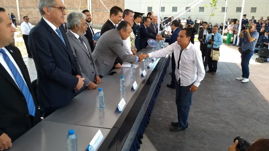 Cuerámaro, Guanajuato.- El alcalde Moy Cortéz junto al secretario del H. Ayuntamiento, Juan Ramón Magaña, acudieron a la inauguración del edificio de la Secretaria de Seguridad Pública, además de la entrega de equipamiento para elementos de seguridad de distintos municipios entre ellos Cuerámaro.