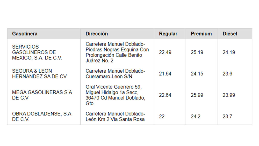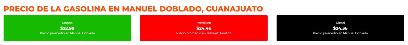 Otros portales como https://gasolinamexico.com.mx/estados/guanajuato/manuel-doblado/ , también muestran que la gasolina en el municipio debería de costar 22.98 pesos, teniendo una variación de más de 1 peso.