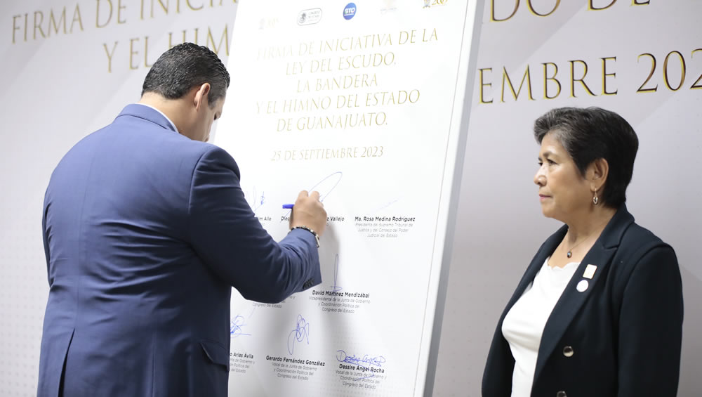Guanajuato, Gto.- El Gobernador del Estado, Diego Sinhue Rodríguez Vallejo, firmó la Iniciativa de Ley del Escudo, la Bandera y el Himno del Estado de Guanajuato a fin de regular los símbolos estatales y promover la identidad cultural y la cohesión social en la entidad.