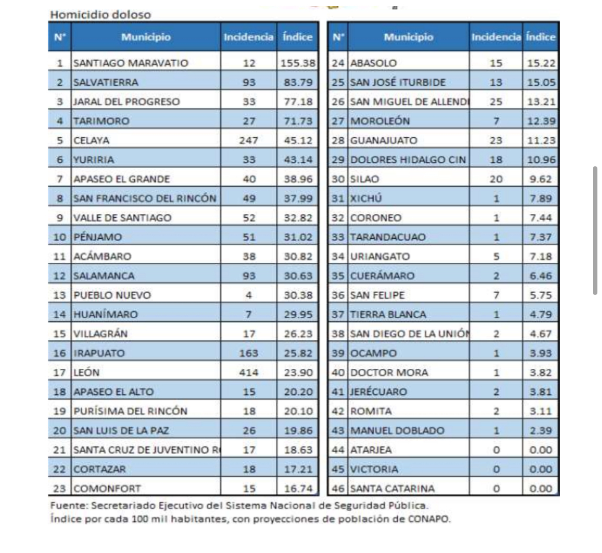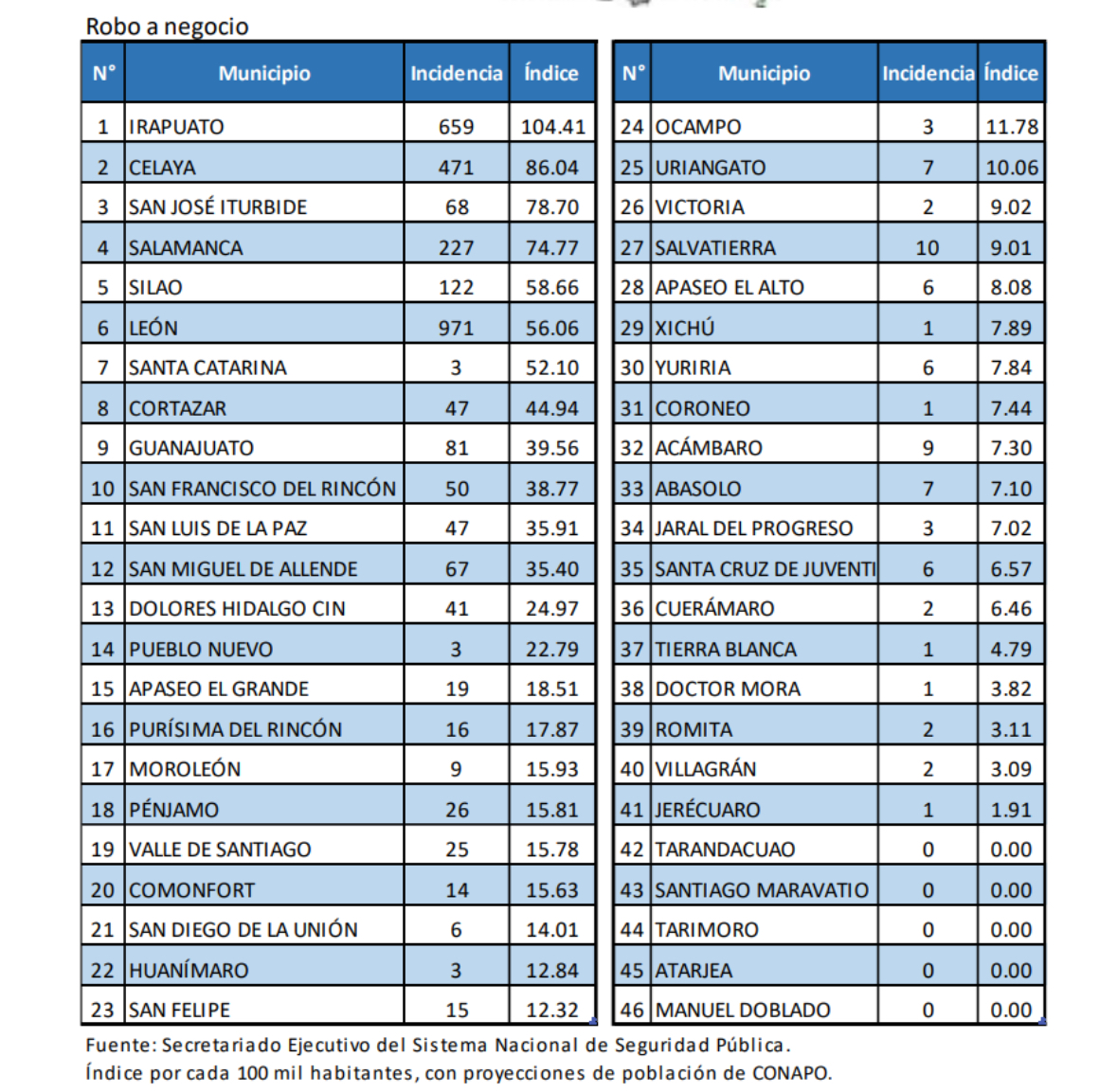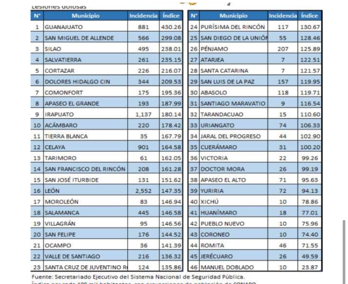 En delitos de alto impacto, Guanajuato es el primero lugar estatal con 665.66 casos por cada 100 mil habitantes. Le siguen San José Iturbide y Silao. Celaya ocupa el lugar 5, Irapuato el 7 y León el 15.