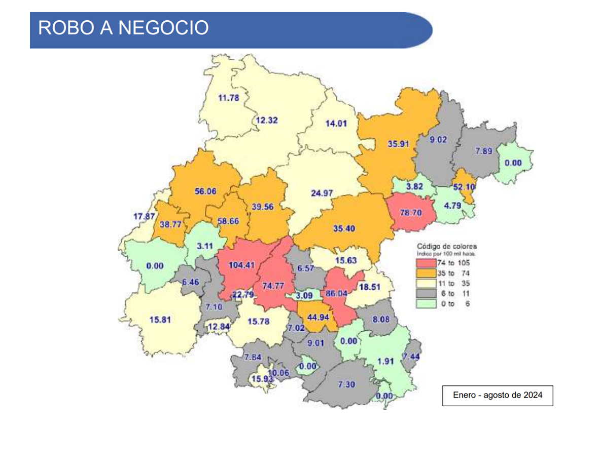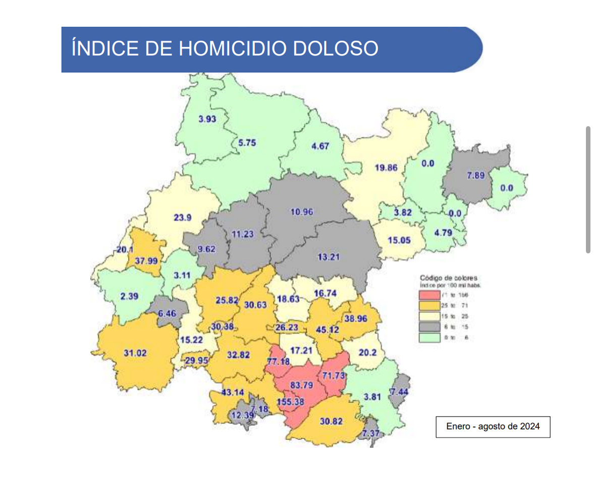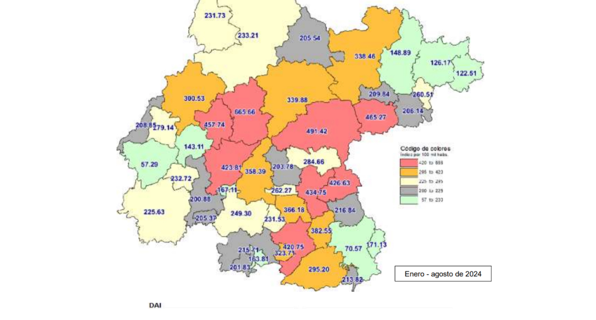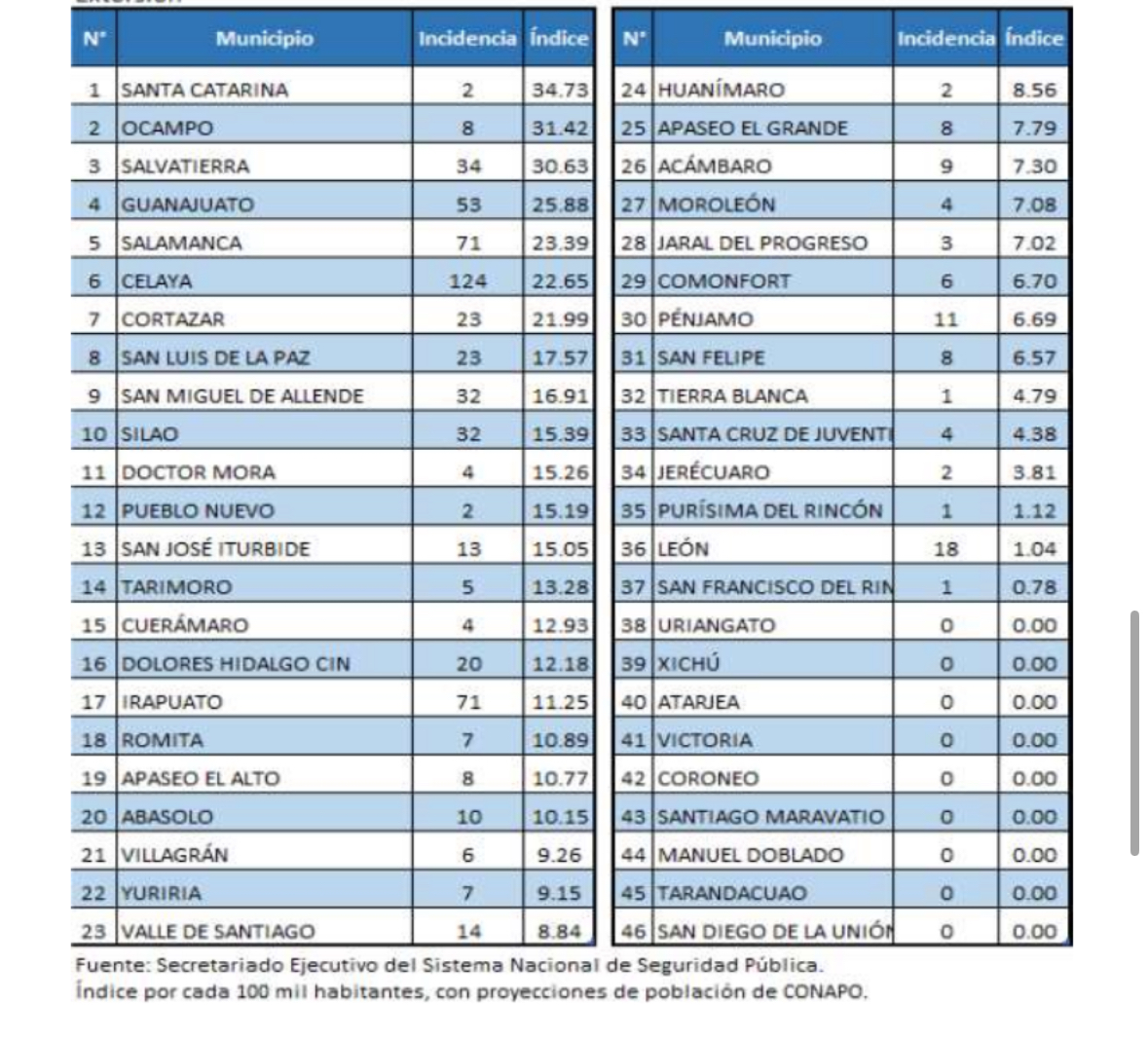 En delitos de alto impacto, Guanajuato es el primero lugar estatal con 665.66 casos por cada 100 mil habitantes. Le siguen San José Iturbide y Silao. Celaya ocupa el lugar 5, Irapuato el 7 y León el 15.