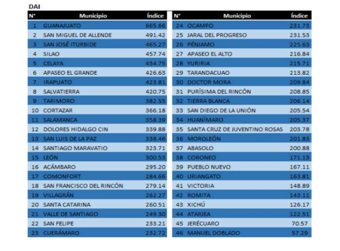 En lo que se refiere a los delitos del fuero común y homicidio doloso, el municipio de Guanajuato es también el primer lugar con 3,000.50. Le siguen San Miguel de Allende, León, Irapuato, Apaseo el Grande, Silao y Celaya.