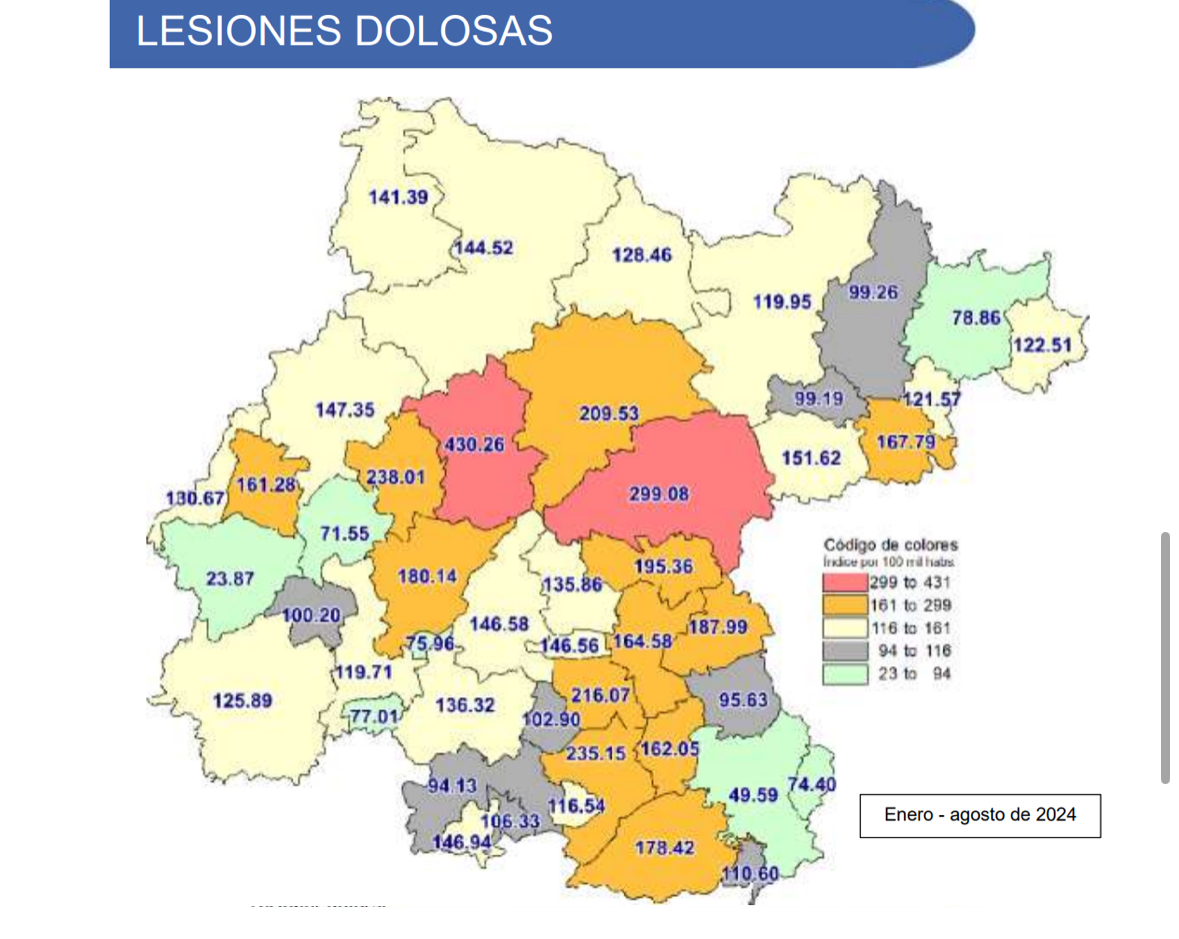 En lesiones dolosas también está en primer lugar con 881 casos y un índice de 430.26. Le siguen San Miguel de Allende y Silao, municipios vecinos.