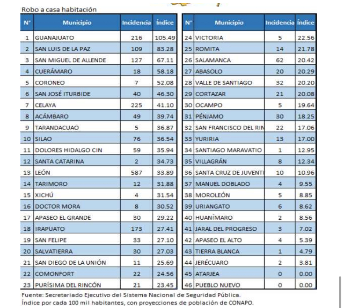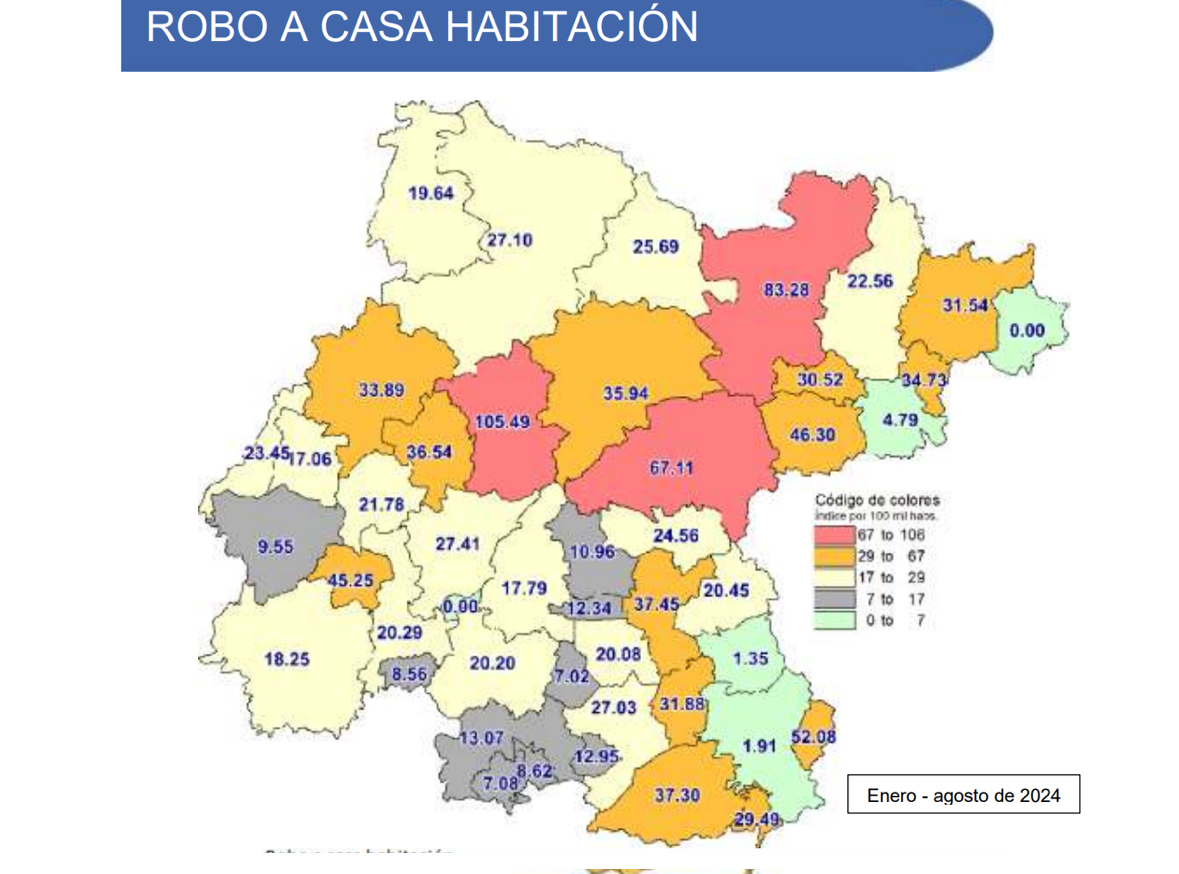 En robo a casa habitación encabeza la lista con 226 incidentes y un índice de 105.49. Irapuato y Celaya encabezan esta lista.