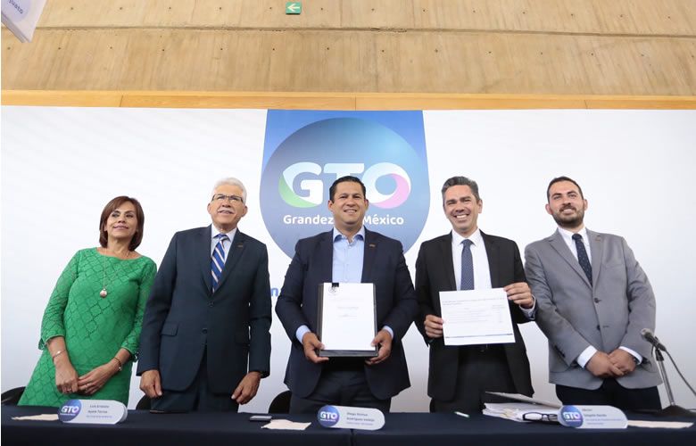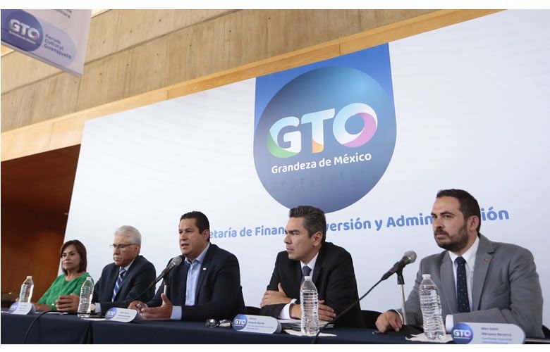 En rueda de prensa el gobernador de Guanajuato, Diego Sinhué Rodríguez Vallejo, acompañado de Héctor Salgado Banda, Secretario de Finanzas, Inversión y Administración para el estado de Guanajuato, Luis Ernesto Ayala Torres, secretario de Gobierno y Raquel Barajas, coordinadora general Jurídica firmó el documento que enviará al Congreso del Estado.