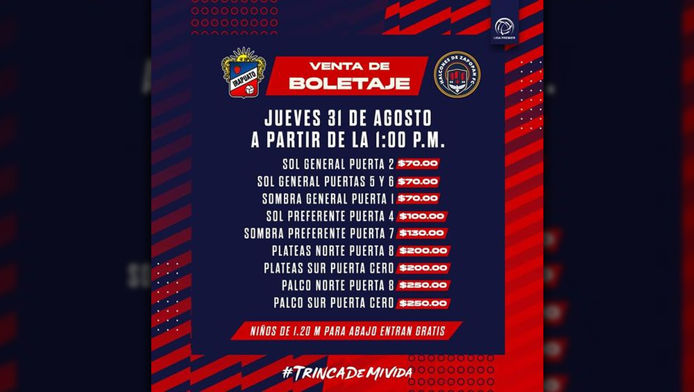 Irapuato, Guanajuato. – Hoy inicia la venta de boletos para el partido del Irapuato a partir de la 1 de la tarde, los aficionados podrán adquirir sus boletos para el encuentro correspondiente a la jornada 4 de la Liga Premier, con precios que van desde los 70 hasta los 250 pesos, los más pequeños también son bienvenidos a apoyar a la “Trinca”, ya que los niños que midan menos de 1.20 metros podrán ingresar al estadio de manera gratuita.