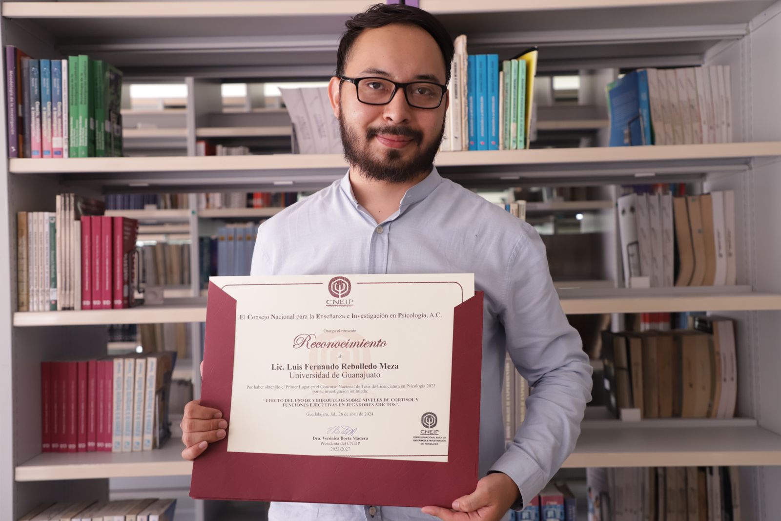 Guanajuato, Gto.- El Consejo Nacional para la Enseñanza e Investigación en Psicología, A.C. (CNEIP) condecoró con el 1° lugar del Concurso Nacional de Tesis en Licenciatura en Psicología al proyecto titulado El efecto del uso de videojuegos sobre niveles de cortisol y funciones ejecutivas en jugadores adictos, investigación realizada por Luis Fernando Rebolledo Meza, egresado de la Licenciatura en Psicología Clínica de la Sede “Juan Pablo II” y actual Estudiante de la Maestría en Ciencias del Comportamiento en el Campus León UG.