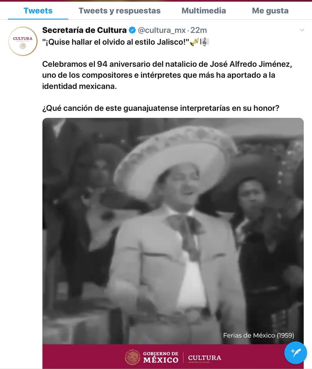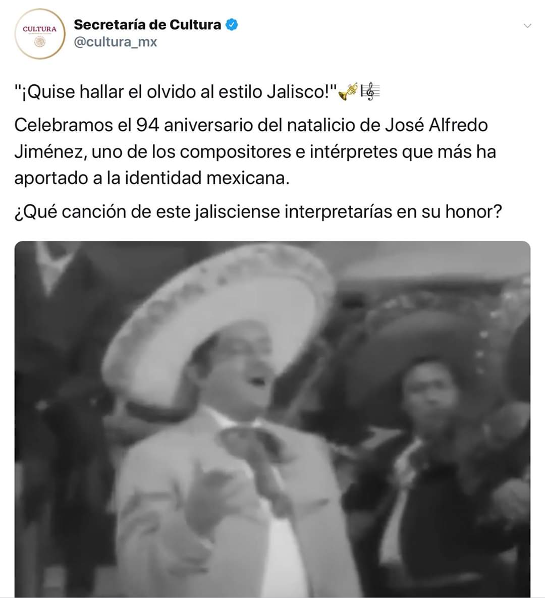 A través de tuiter, la Secretaría de Cultura, publicó que hoy se celebra el 94 aniversario del nacimiento de José Alfredo Jiménez, un artista originario de Dolores Hidalgo y que ahora al parecer este organismo federal le dio su origen en Jalisco.