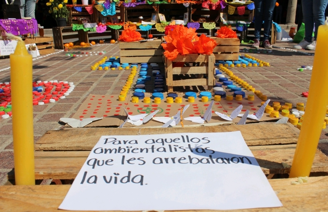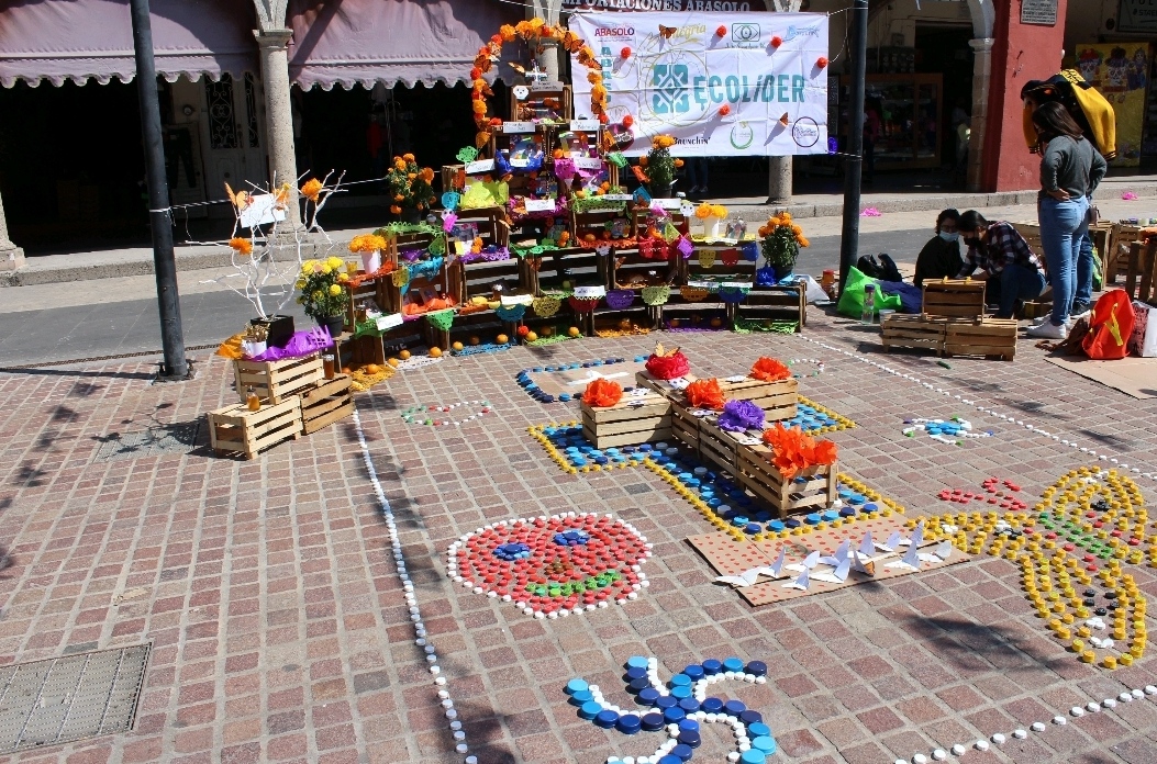Tapas de colores, hojas reusables, cajas de madera, cartón reciclado y hasta aceite quemado para las velas, adornaban este altar.