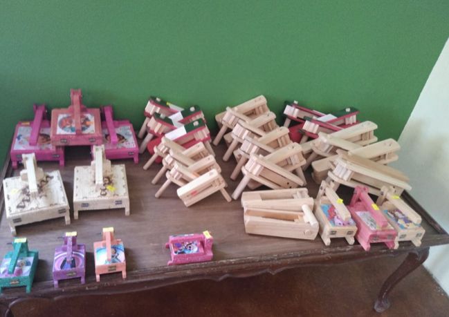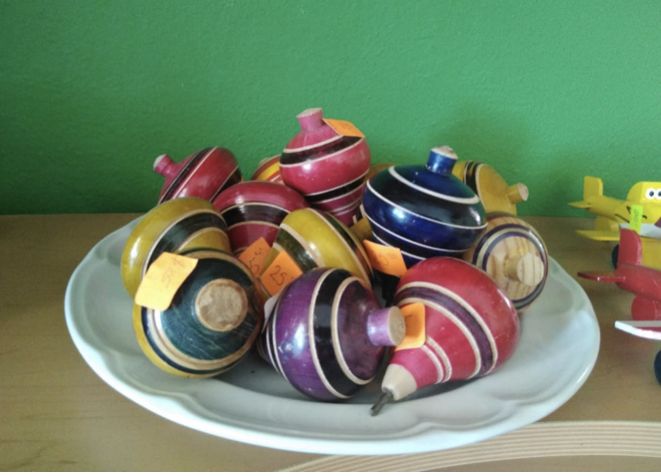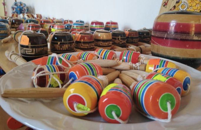 Juguetes que van desde coches, guitarras, valeros, flautas, trompo, y juegos de mesas todos elaborados de madera, así como las tradicionales muñecas de cartón, cada uno de ellos representativos de su natal tierra por mencionar: Irapuato, Comonfort, Juventino Rosas, Celaya, Querétaro y Paracho, Michoacán entre otros.