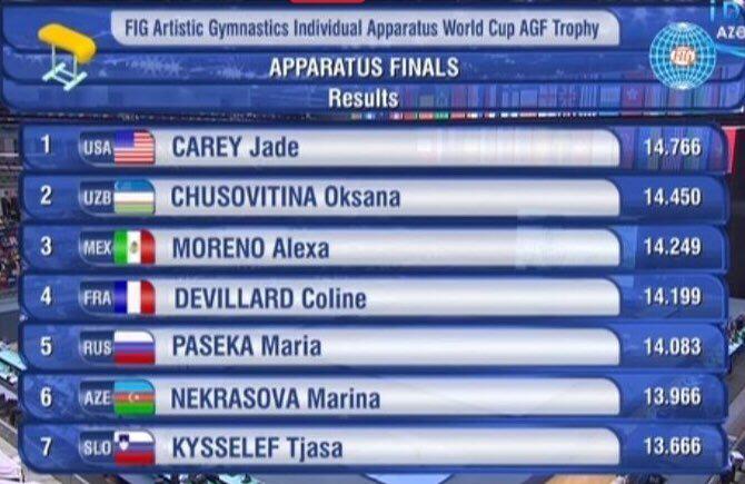 La gimnasta bajacaliforniana obtuvo el tercer lugar en la competencia mundial con un puntaje de 14.249, solo debajo de la estadounidense Jade Carey, quien obtuvo el primer lugar con 14.766 unidades, mientras que la uzbeka, Oksana Chusovitina ocupó el segundo puesto con 14.450 puntos.