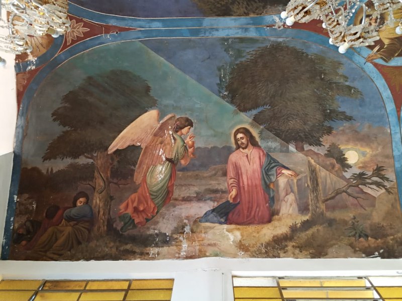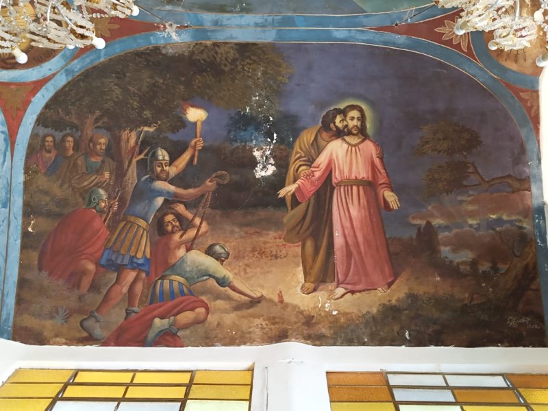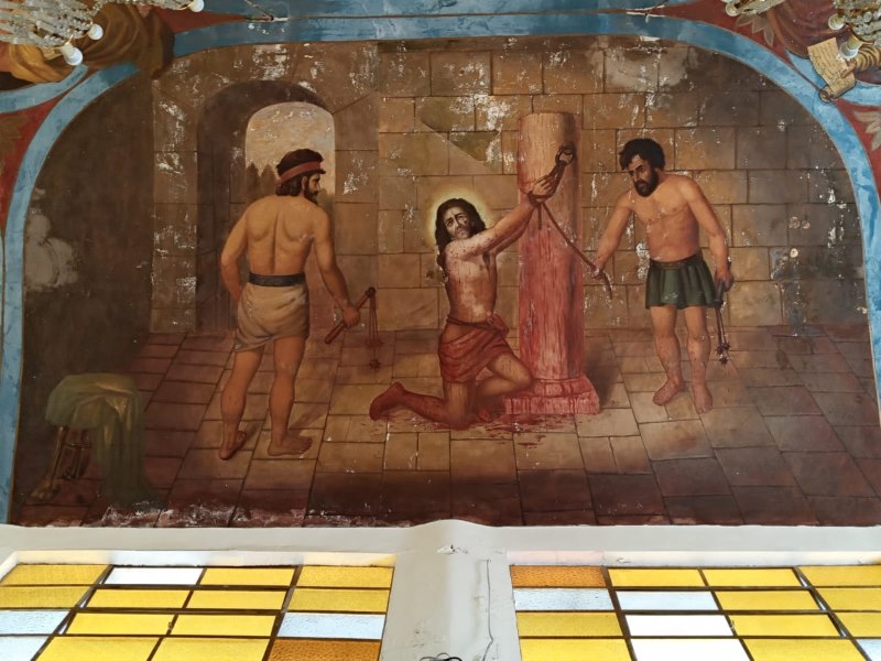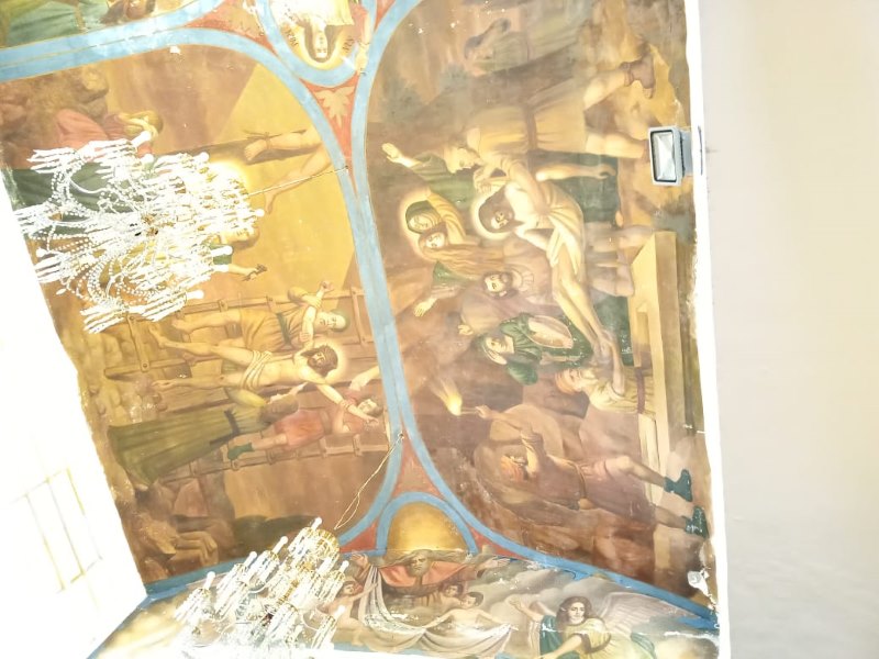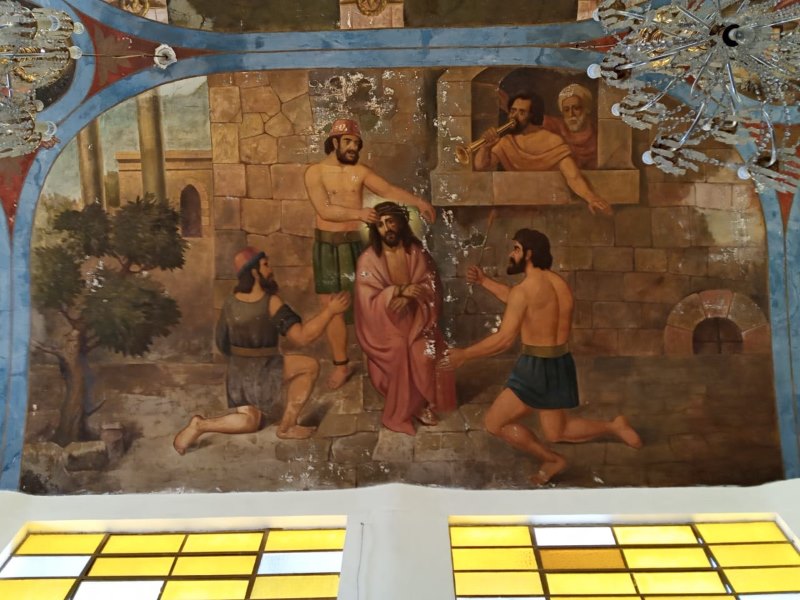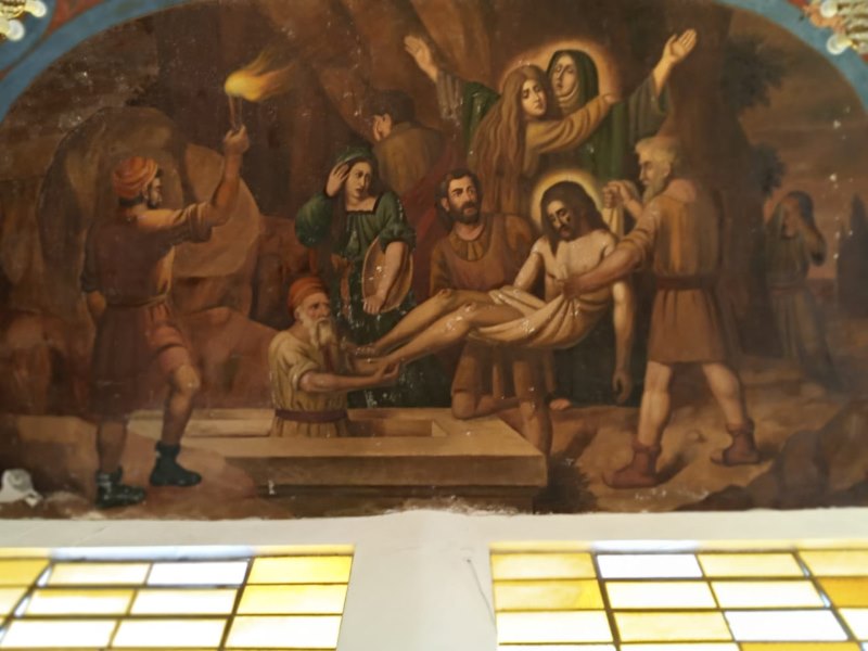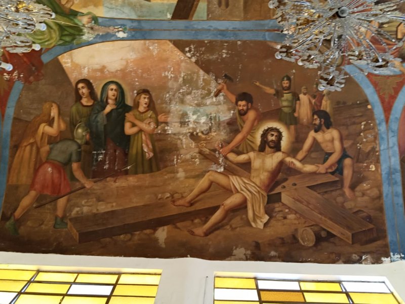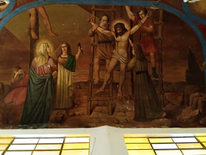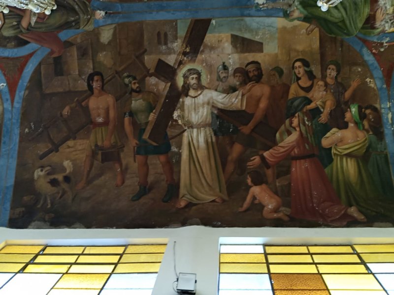 En la segunda imagen se aprecia el contraste del paso del tiempo en los murales con cierto deterioro, además de que ya no está presente el mural que estaba detrás del altar donde está el Cristo.
