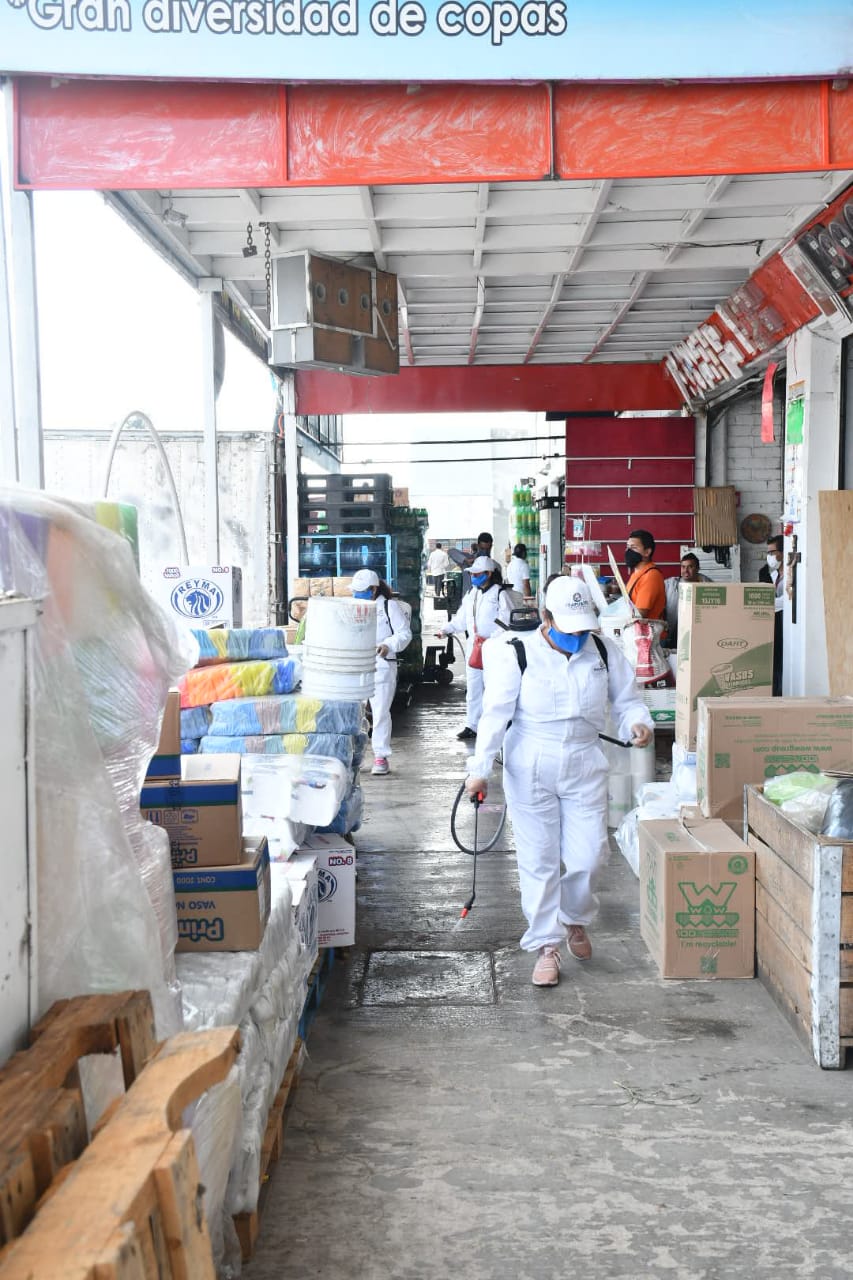 Para la desinfección de los espacios de comercio, se contó con la participación de 23 personas, quienes rociaron el líquido desinfectante sobre las superficies de 800 bodegas, aproximadamente.