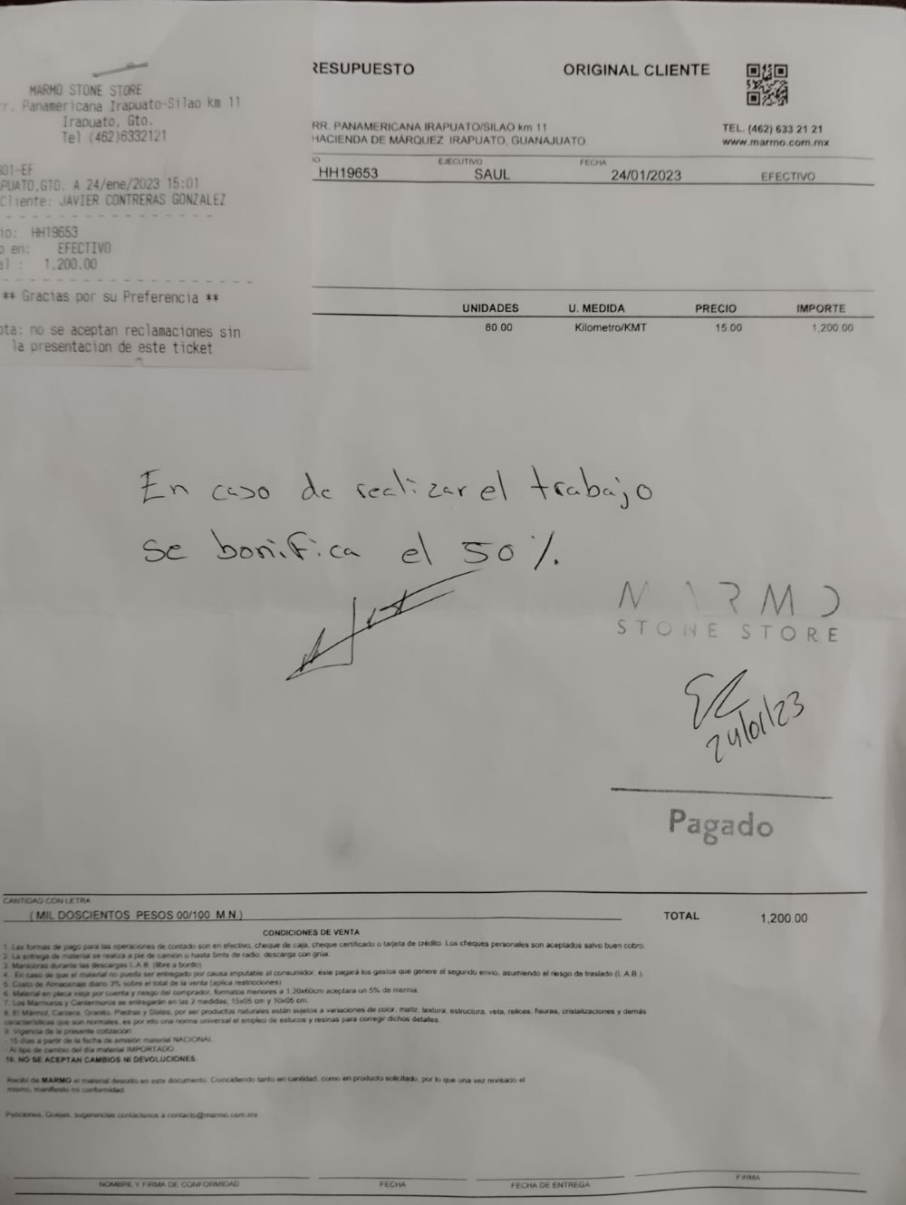 Irapuato, Guanajuato.- “La tienda Marmo Stone Store, más conocida como Mármoles y canteras Godoy una empresa irresponsable y mentirosa”, así lo informó Javier Contreras un comprador que tuvo que recurrir a la Profeco para que pudiera intervenir en la entrega ya no del material, sino que le pudieran regresar el dinero.